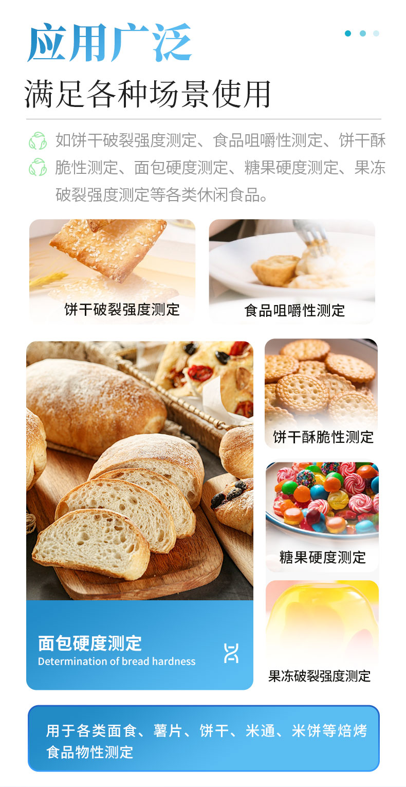 食品硬度儀適用于各類面食、薯片、餅干、米通、米餅等焙烤食品物性測定,如餅干破裂強度測定、食品咀嚼性測定、餅干酥脆性測定、面包硬度測定、糖果硬度測定、果凍破裂強度測定等各類休閑食品。