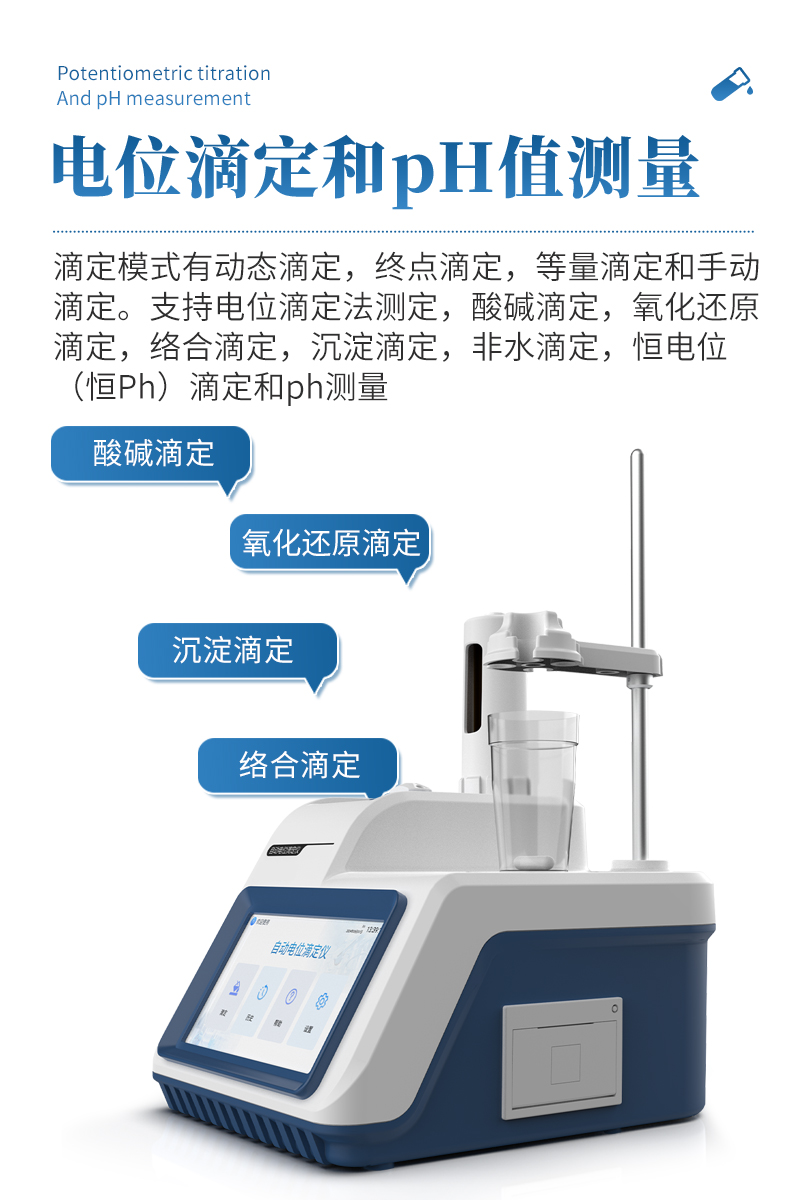 自動(dòng)電位滴定儀是一種用于化學(xué)分析的精密儀器,他通過自動(dòng)添加滴定劑來(lái)確定樣品中特定成分的濃度。該儀器基于電位滴定原理工作,即根據(jù)在滴定過程中電池電動(dòng)勢(shì)的變化來(lái)確定滴定終點(diǎn)的一款滴定設(shè)備。設(shè)備滿足國(guó)家檢定規(guī)程JJG 814-2015《自動(dòng)電位滴定儀》儀器級(jí)別中的0.05級(jí)別,即儀器**示值誤差為±1.5%,儀器示值重復(fù)性≤0.2%
