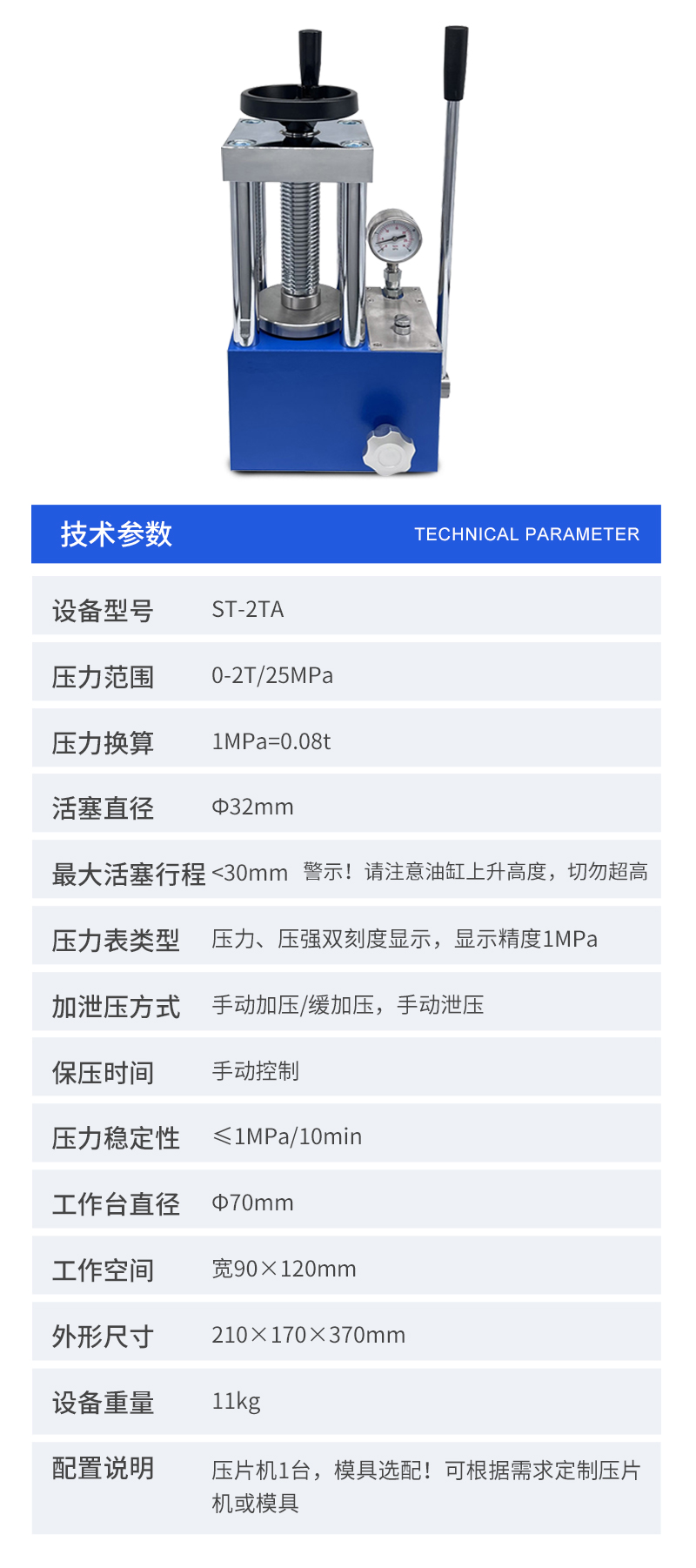 手動壓片機(jī)該機(jī)采用一體式結(jié)構(gòu),手動液壓驅(qū)動,兩立柱設(shè)計,具有造型美觀、操作方便、體積小巧、工作空間大等優(yōu)點(diǎn),非常適合拖進(jìn)手套箱內(nèi)使用;配上特定模具,可對各種粉末材料壓制成型,廣泛應(yīng)用于科研、教學(xué)、檢測、催化、制藥等各個領(lǐng)域。