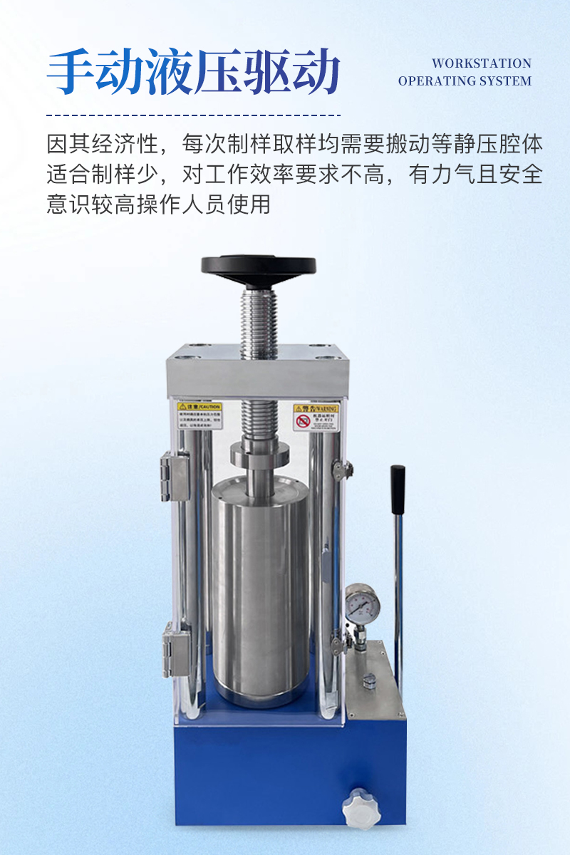 手動等靜壓機該機采用手動液壓驅(qū)動,是等靜壓系列中的入門機型,因其經(jīng)濟性,每次制樣取樣均需要搬動等靜壓腔體,適合制樣少,對工作效率要求不高,有力氣且安全意識較高的男士操作使用。