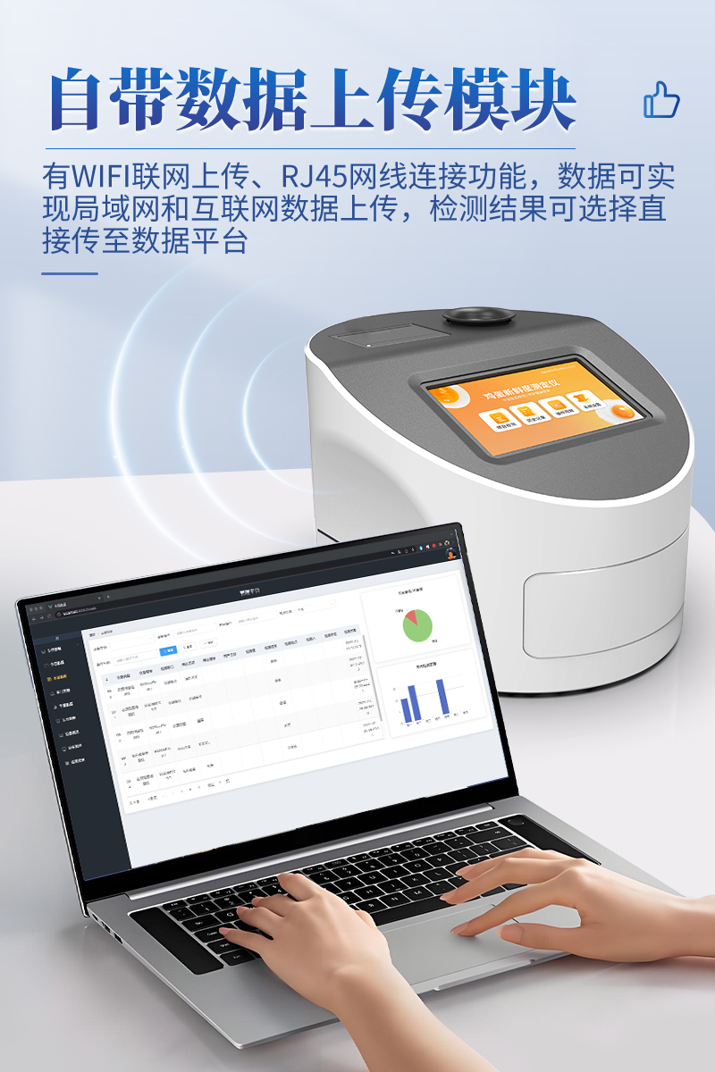 7.儀器可本機(jī)存儲數(shù)據(jù),可連接USB端口將數(shù)據(jù)導(dǎo)出存儲。另外,儀器自帶數(shù)據(jù)上傳模塊,具有WIFI聯(lián)網(wǎng)上傳、RJ45網(wǎng)線連接功能,數(shù)據(jù)可實(shí)現(xiàn)局域網(wǎng)和互聯(lián)網(wǎng)數(shù)據(jù)上傳,檢測結(jié)果可選擇直接傳至數(shù)據(jù)平臺,進(jìn)行大數(shù)據(jù)分析處理與數(shù)據(jù)統(tǒng)計(jì),達(dá)到長期分析監(jiān)測的目的。