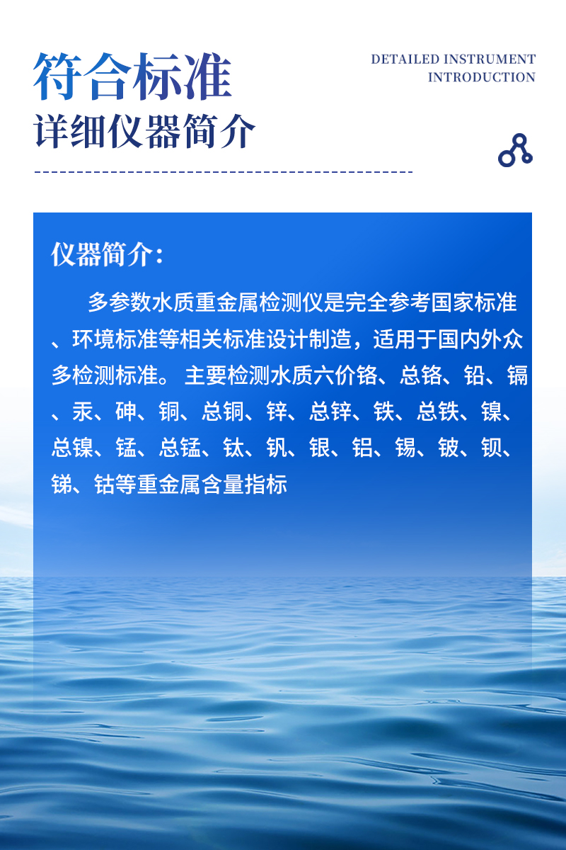多參數(shù)水質(zhì)重金屬檢測儀是完全參考國家標(biāo)準(zhǔn)、環(huán)境標(biāo)準(zhǔn)等相關(guān)標(biāo)準(zhǔn)設(shè)計(jì)制造,適用于國內(nèi)外眾多檢測標(biāo)準(zhǔn)。 主要檢測水質(zhì)六價(jià)鉻、總鉻、鉛、鎘、汞、砷、銅、總銅、鋅、總鋅、鐵、總鐵、鎳、總鎳、錳、總錳、鈦、釩、銀、鋁、錫、鈹、鋇、銻、鈷等重金屬含量指標(biāo);本儀器兼具智能數(shù)據(jù)分析功能,圖表、列表顯示數(shù)據(jù),分析一目了然;高清晰度彩色液晶觸摸顯示屏,Android智能操作系統(tǒng),中文顯示界面,中英文鍵盤,人性化操作,使用更簡單。